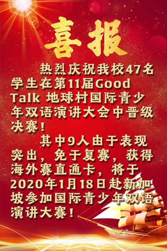 其中 9 人由于表現(xiàn)突出,免于復(fù)賽,獲得海外賽直通卡,將于 2020 年 1 月 18 日赴新加坡參加國際雙語演講大賽!