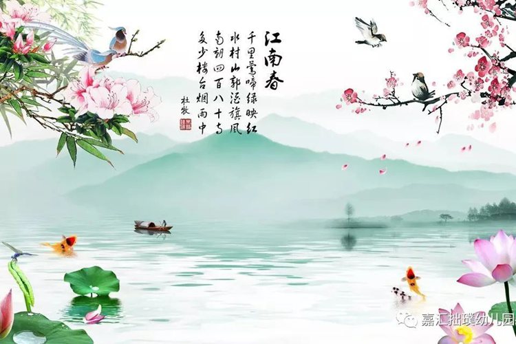 遼闊的干里江南春景美如畫,鶯歌燕舞綠葉映襯鮮艷紅花。