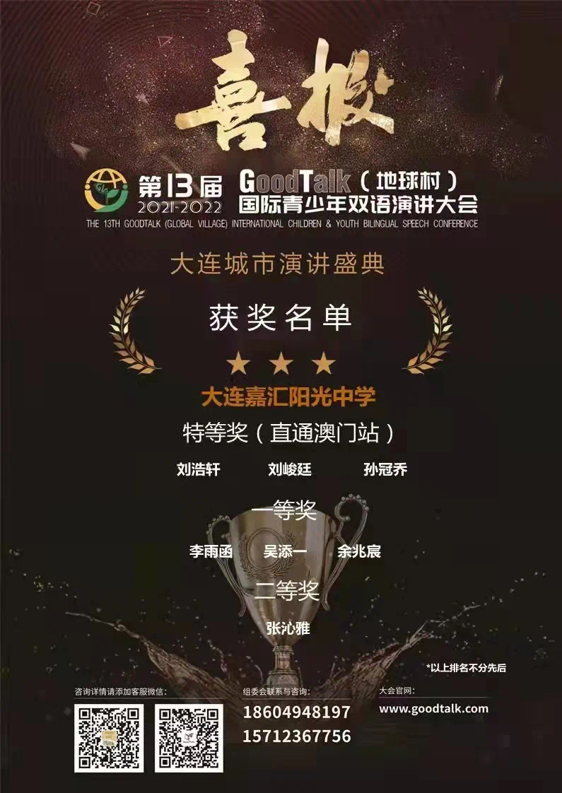 在第 13 屆 Good Talk(地球村) 國際青少年雙語演講大賽大連賽區(qū)決賽中,我校共十二名學(xué)生參加城市決賽賽,七名學(xué)生獲獎!