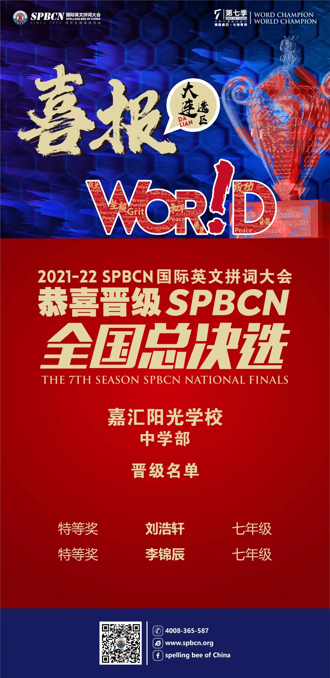 2021-22 SPBCN 國(guó)際英文拼詞大會(huì)第七季城市總決選如期舉行。本屆比賽的選手個(gè)個(gè)都是佼佼者,經(jīng)歷了初賽,復(fù)賽的 「修煉」 后脫穎而出,最終站到了全國(guó)總決選的舞臺(tái)上。在經(jīng)過(guò)緊張而激烈的角逐之后,我校七年一班劉浩軒同學(xué),七年四班李錦辰同學(xué),以優(yōu)異的成績(jī)成功晉級(jí)全國(guó)比賽,期待他們?cè)谌珖?guó)總決賽中再創(chuàng)佳績(jī)。