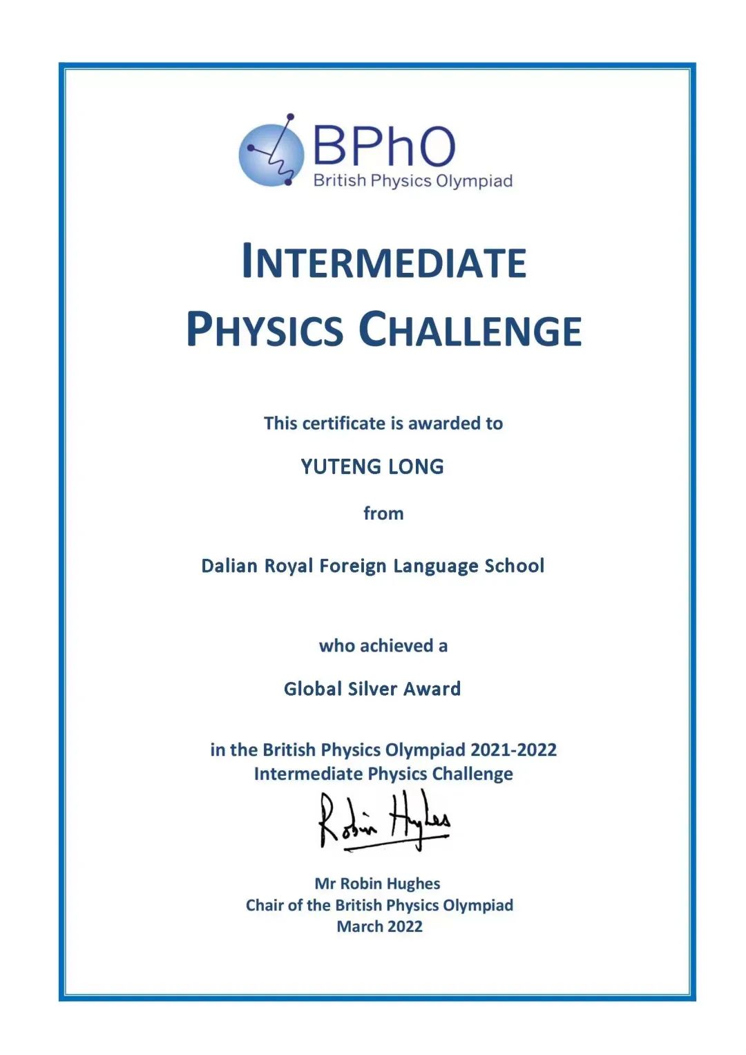 9.5 班龍宇騰同學(xué)在中級(jí)物理挑戰(zhàn)賽 IPC(9-10 年級(jí)組) 以 23.5 分的優(yōu)異成績(jī),榮獲全球銀獎(jiǎng)。