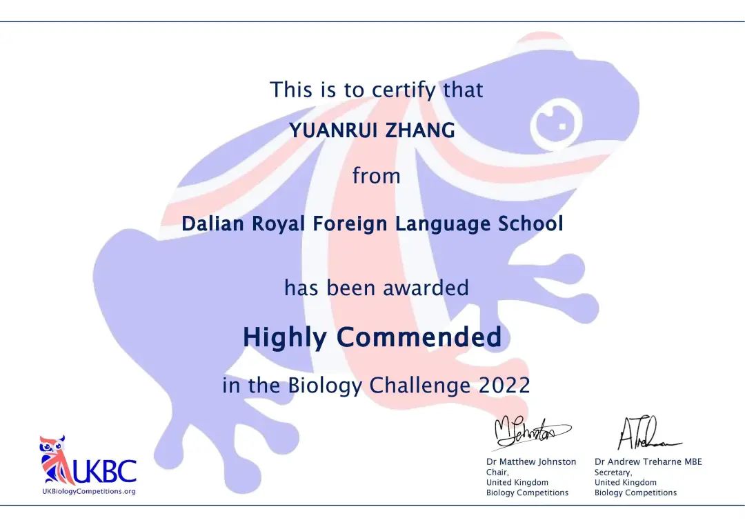 8.7 班張淵瑞同學(xué)在英國(guó)生物思維挑戰(zhàn)賽 7-9 年級(jí)組中,榮獲全球杰出獎(jiǎng)。