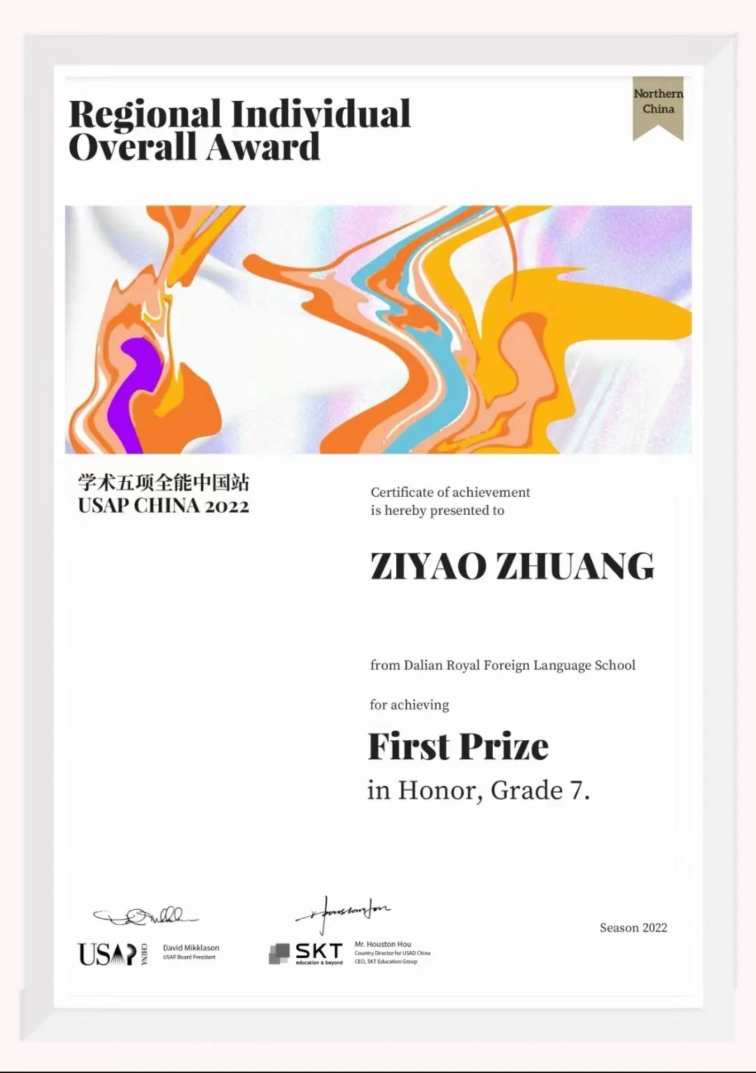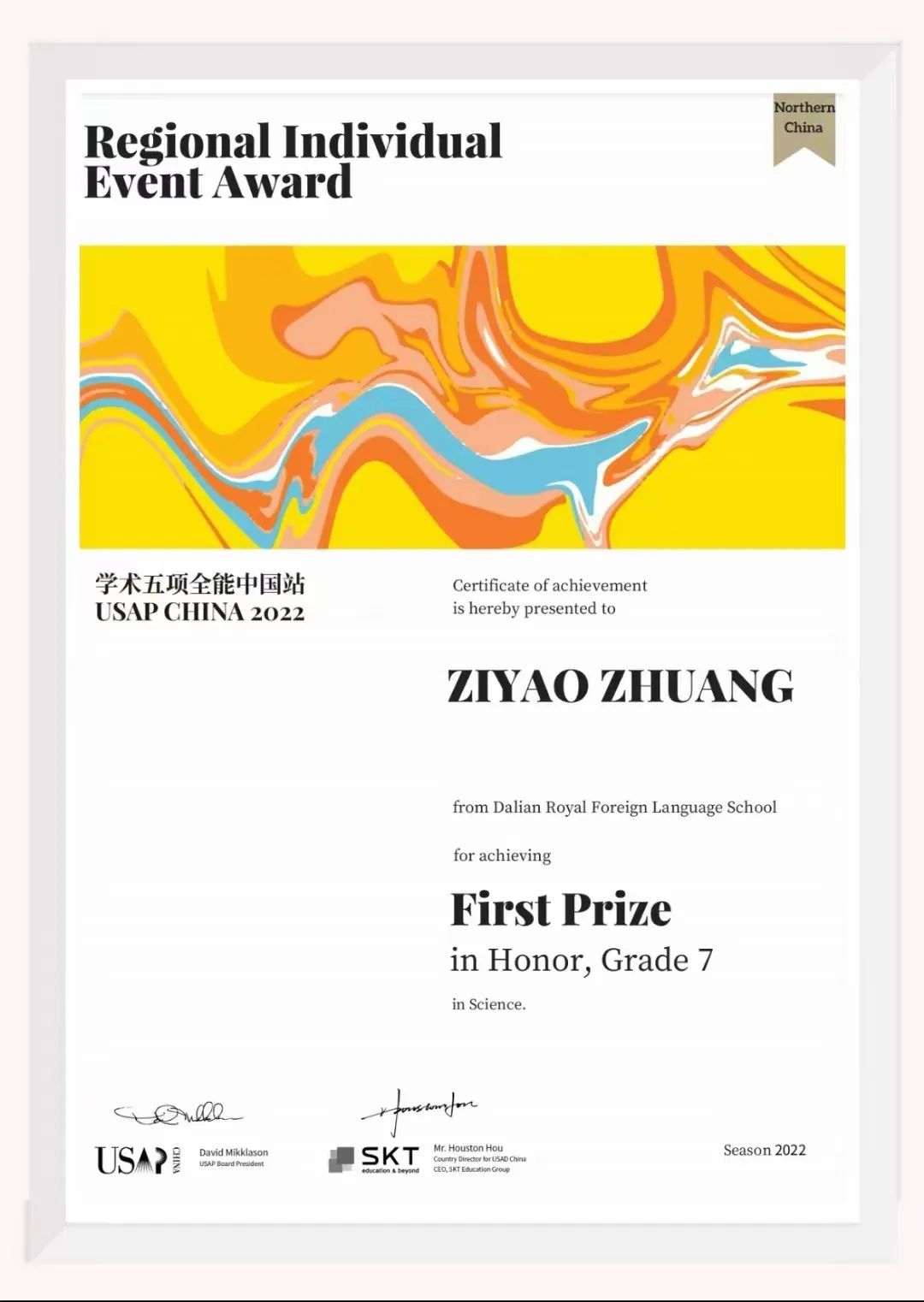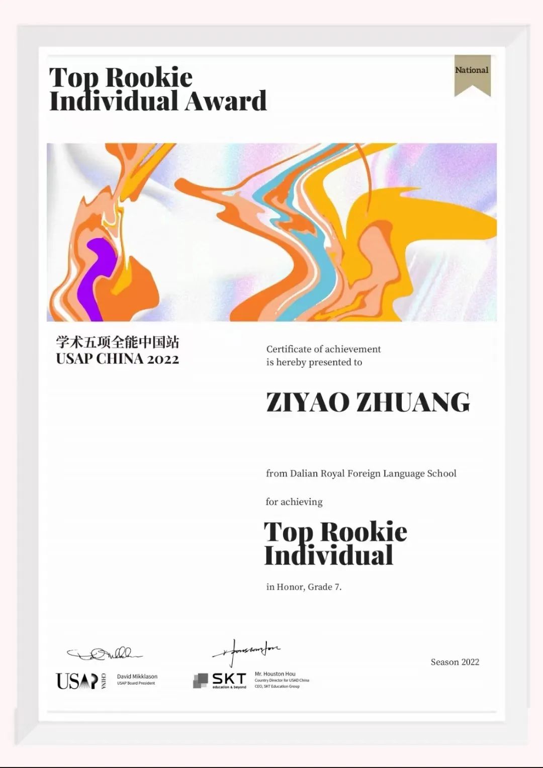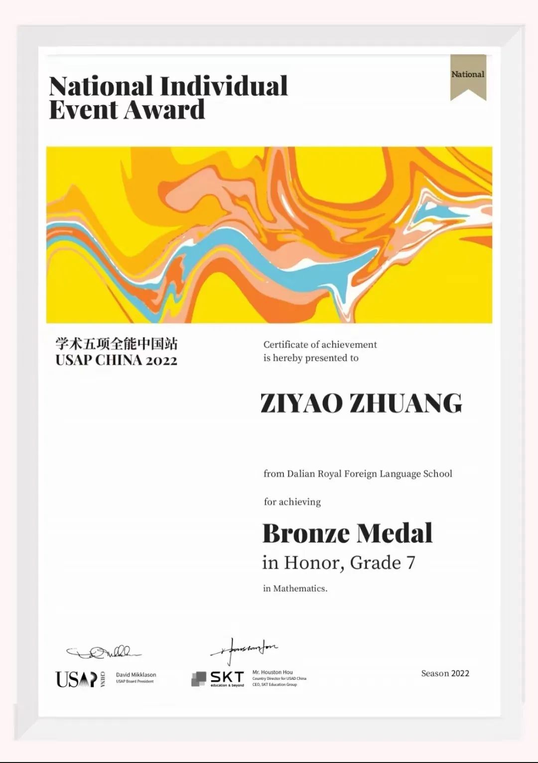 7.4 班莊子遙同學(xué)在 USAP 美國(guó)學(xué)術(shù)五項(xiàng)全能中國(guó)賽區(qū) Honor 組比賽中 (難度最高組別,年級(jí)排名前 20% 的學(xué)生有資格參加)