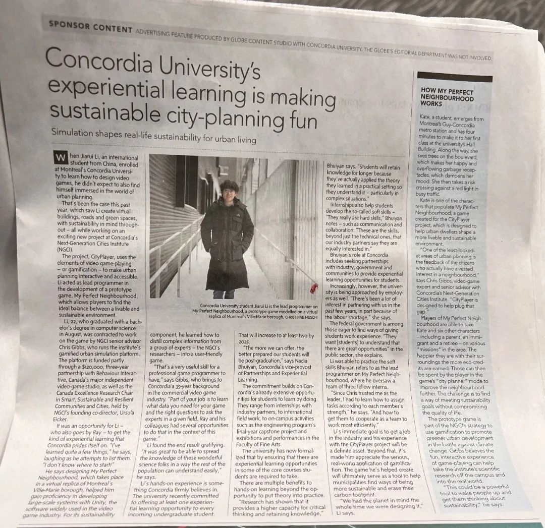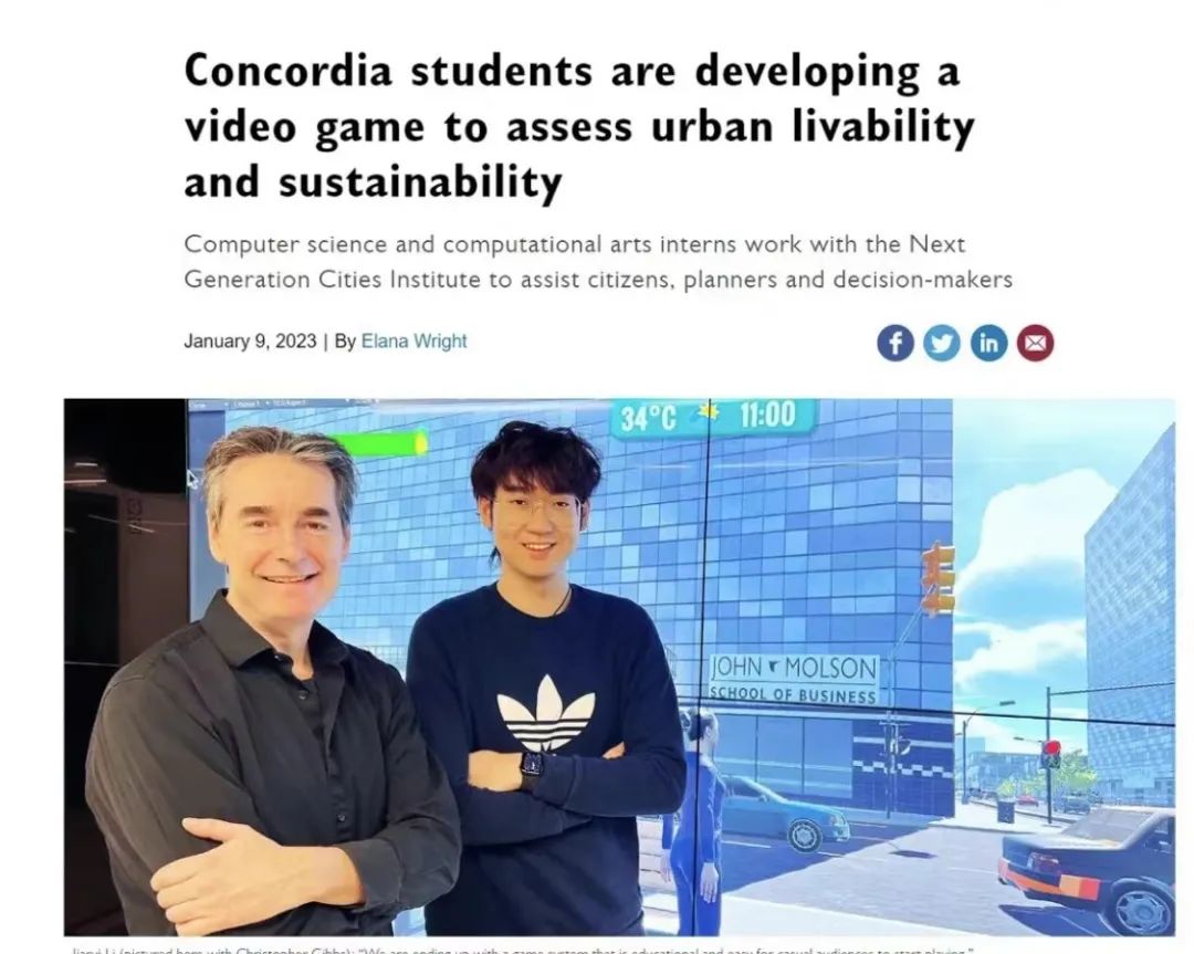 2023 年 2 月 10 日,加拿大最具影響力的主流媒體 《環(huán)球郵報(bào)》 以 《康考迪亞大學(xué)的體驗(yàn)式學(xué)習(xí)讓可持續(xù)城市規(guī)劃變得更有趣》 為醒目標(biāo)題,大篇幅報(bào)道了 Jiarui Li 帶領(lǐng)團(tuán)隊(duì)研發(fā)出 CityPlayer 的游戲軟件,在游戲中探索實(shí)時(shí)可視化城市發(fā)展的潛在解決方案,幫助設(shè)想和建設(shè)更宜居和可持續(xù)發(fā)展的城市。報(bào)道中反復(fù)提及到的中國(guó)留學(xué)生 Jiarui Li ,便是研發(fā)這款意義非凡軟件的首席程序官李嘉瑞,他是我們大連嘉匯中學(xué) 2015 屆的一位優(yōu)秀畢業(yè)生。