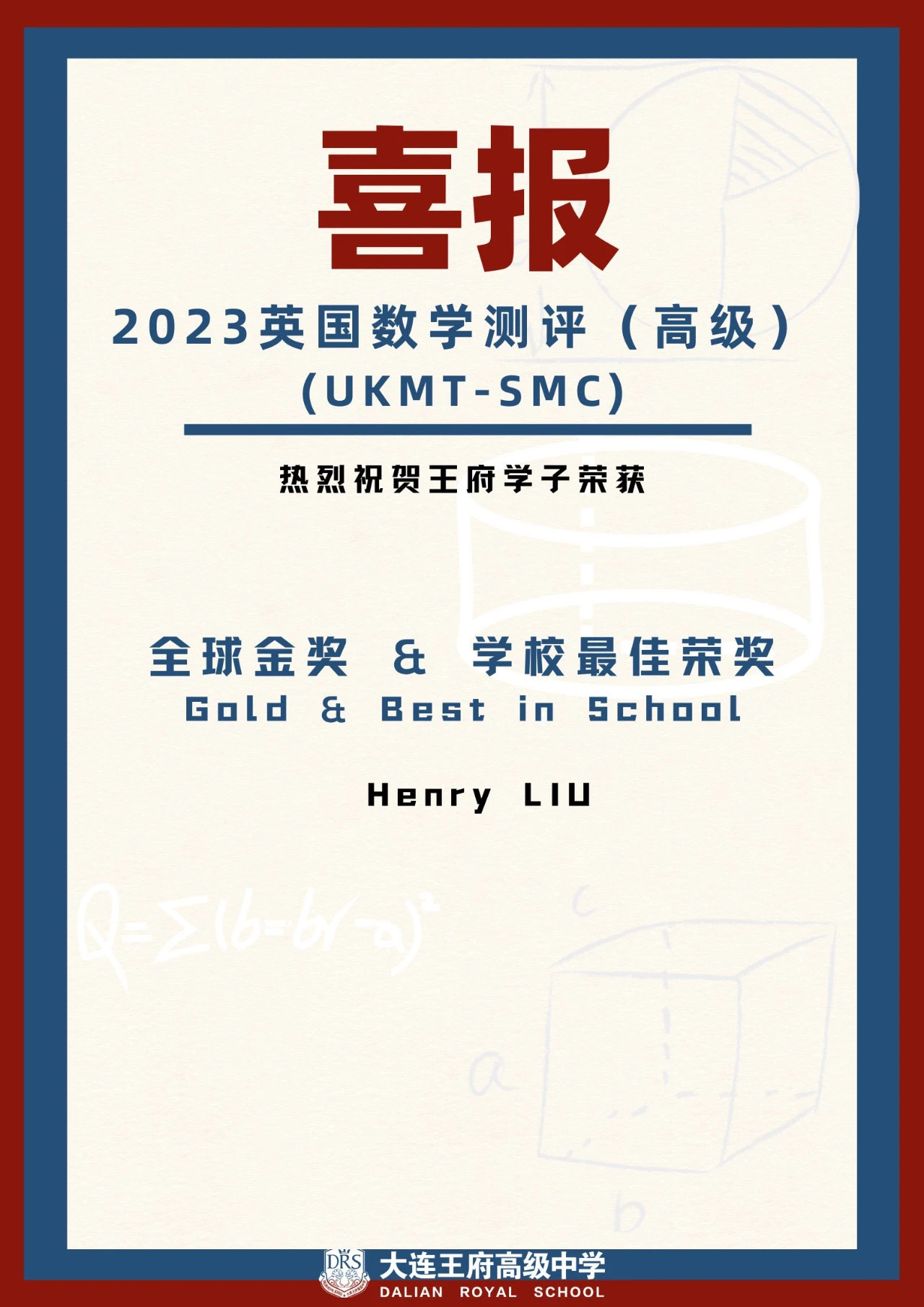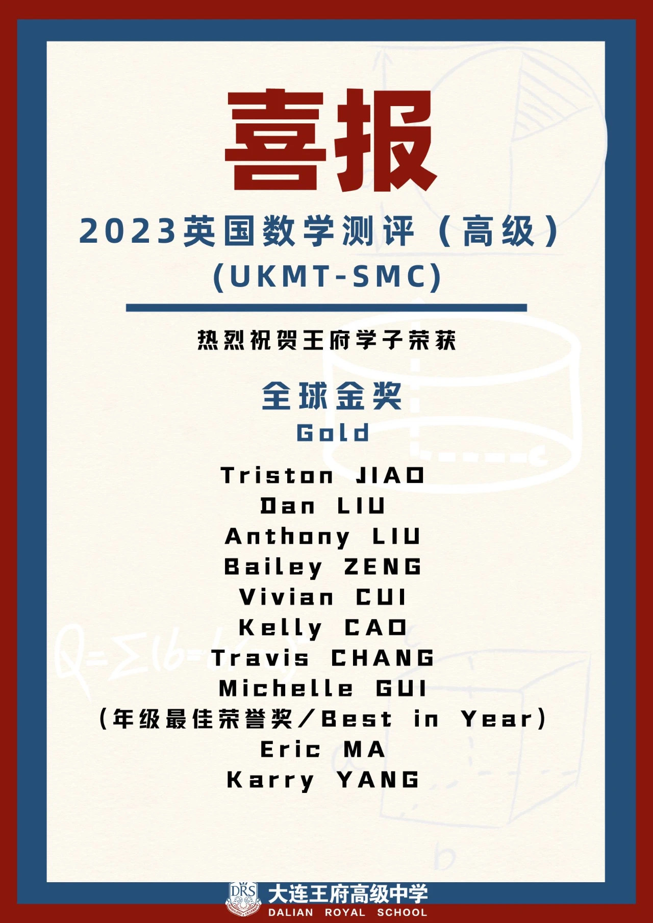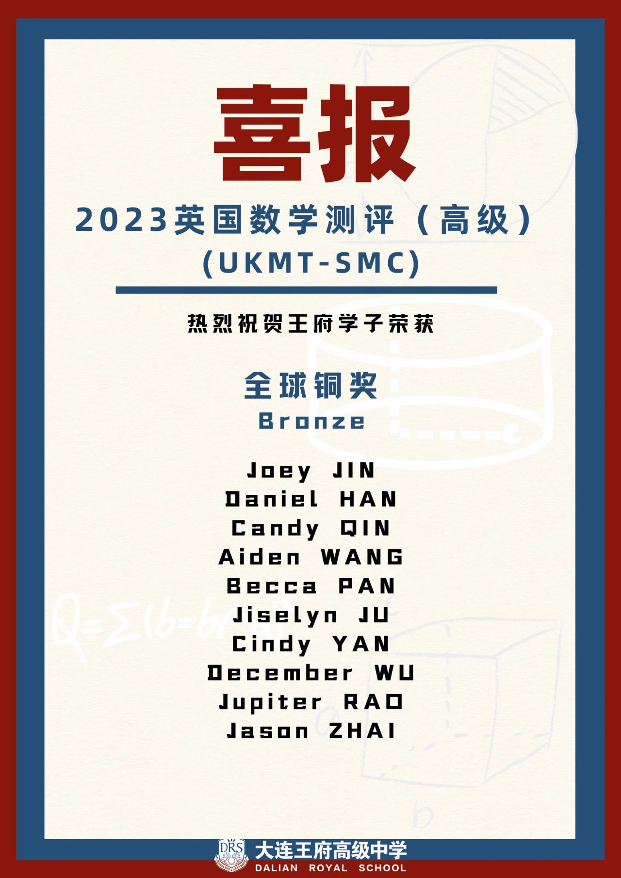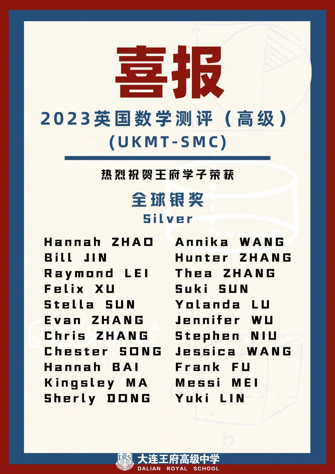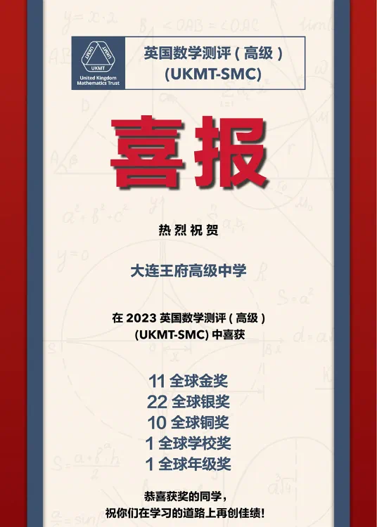 近日,在 2023 英國數(shù)學(xué)測評-高級 (UKMT-SMC) 競賽中,大連王府高級中學(xué)取得優(yōu)異成績:11 位學(xué)子獲得全球金獎,其中 1 位學(xué)子同時(shí)榮獲學(xué)校最佳榮譽(yù),22 位學(xué)子獲得全球銀獎,10 位學(xué)子獲得全球銅獎。