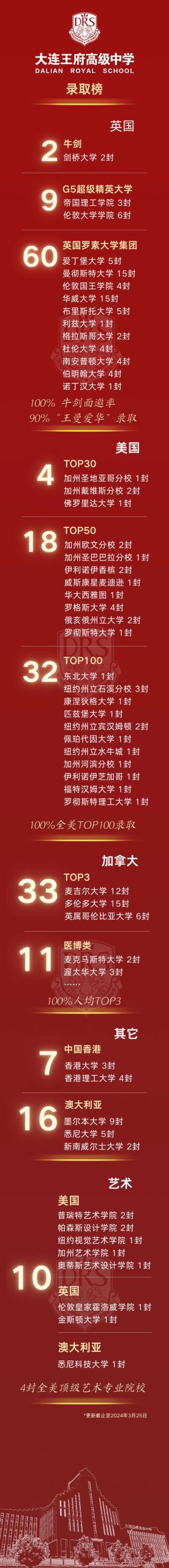 英國留學(xué)方面,院校申請(qǐng)?jiān)俅稳〉猛黄疲γ嫜蔬_(dá) 100%,2 封劍橋預(yù)錄取收入囊中;G5 預(yù)錄取數(shù)量不斷增長;90% 的學(xué)生獲得 「王曼愛華」 的青睞! 美國留學(xué)方面,院校申請(qǐng)厚積薄發(fā),2/3 的學(xué)生獲得全美 TOP50 名校錄取;100% 獲得全美 TOP100 名校錄??!加拿大留學(xué)方面,院校申請(qǐng)質(zhì)效兼顧,100% 人均 TOP3 錄取,單一院校錄取數(shù)量不斷刷新紀(jì)錄!中國香港,以及其他國家和地區(qū)院校申請(qǐng)發(fā)揮穩(wěn)定,結(jié)出碩果。藝術(shù)申請(qǐng)成果斐然,4 封全美頂級(jí)藝術(shù)專業(yè)院校 offer 花落大連王府,音樂制作、藝術(shù)設(shè)計(jì)、視覺傳媒等方向大放異彩!
