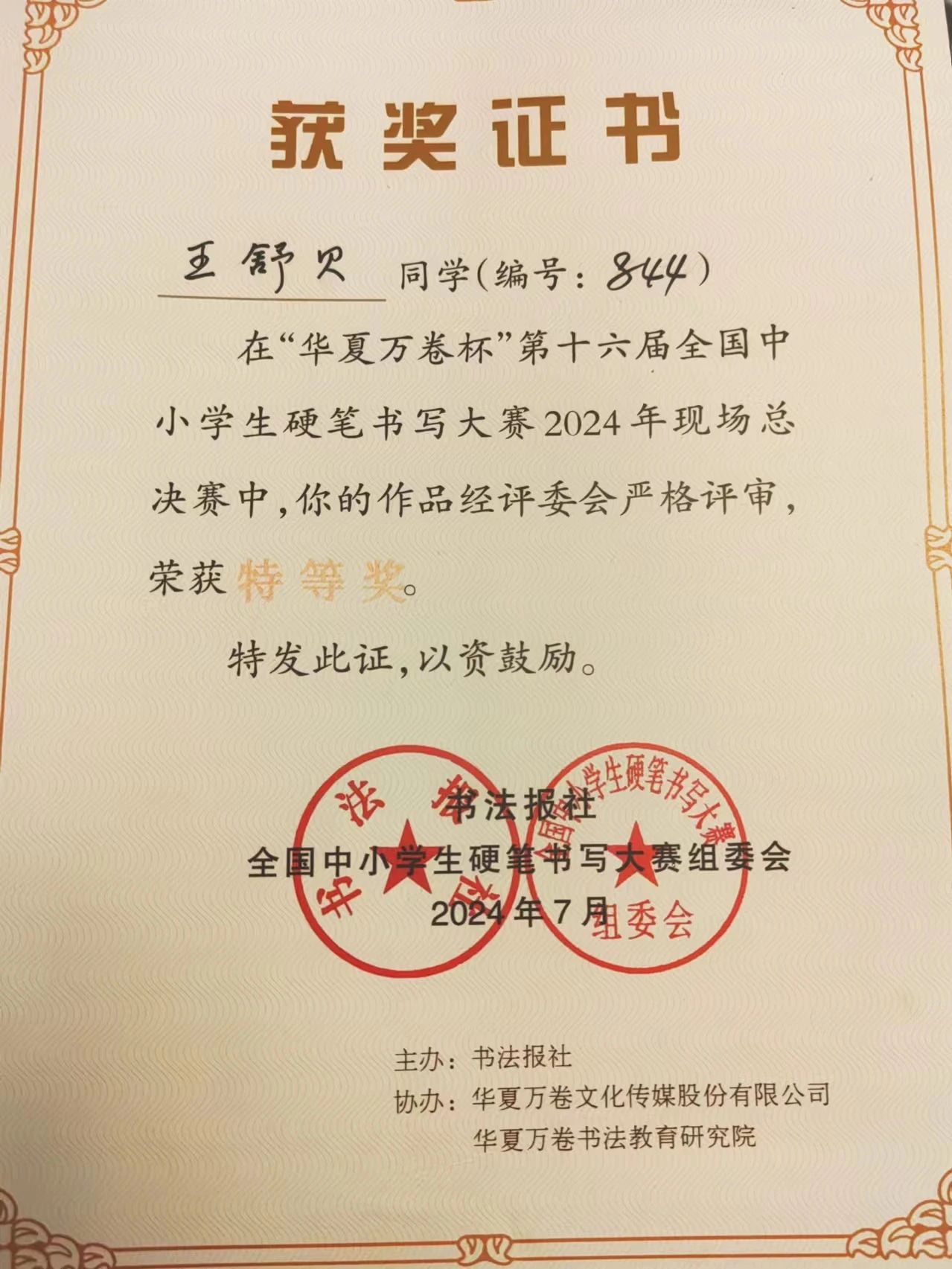 近日,在由書法報(bào)社主辦,華夏萬卷文化傳媒有限公司、華夏萬卷書法教育研究院協(xié)辦的第 16 屆 「華夏萬卷杯」 全國中小學(xué)生硬筆書寫大賽總決賽上,大連嘉匯中學(xué)初一 (10) 班的王舒貝斬獲中學(xué)組全國特等獎。