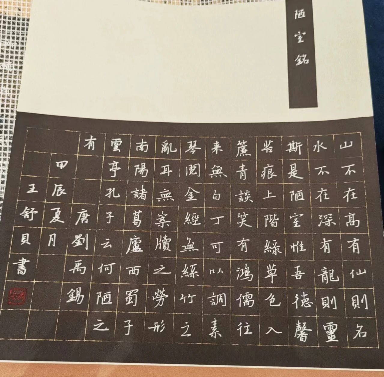 王舒貝同學(xué)學(xué)練書法多年,擁有扎實(shí)的基本功。此次大賽的作品 《陋室銘》 恰好為我們嘉匯中學(xué)的校文,王舒貝帶著特殊的情感真誠書寫。搭配白筆黑紙,在作品布局、書寫形式等方面都獨(dú)具匠心,筆畫夯實(shí)厚重,輕重線條頓挫,流暢的筆勢連帶融入了作者對這首銘的理解和感悟。