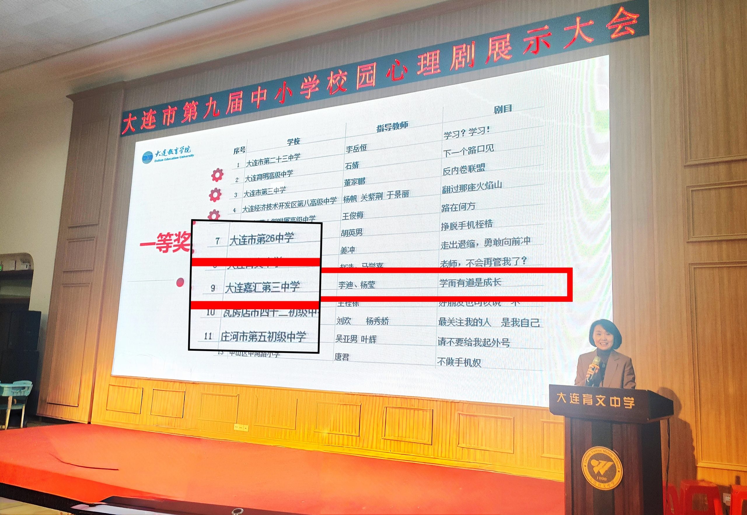 近日,由大連教育學(xué)院心理研訓(xùn)中心組織的第九屆校園心理劇大賽在熱烈的氛圍中圓滿落下帷幕。此次大賽吸引了眾多學(xué)校參與,經(jīng)過激烈的角逐,最終大連嘉匯第三中學(xué)李迪老師創(chuàng)作、指導(dǎo)的劇目 《學(xué)而有道是成長》 憑借其深刻的主題、學(xué)生精湛的表演以及出色的呈現(xiàn),榮獲本次大賽一等獎。
