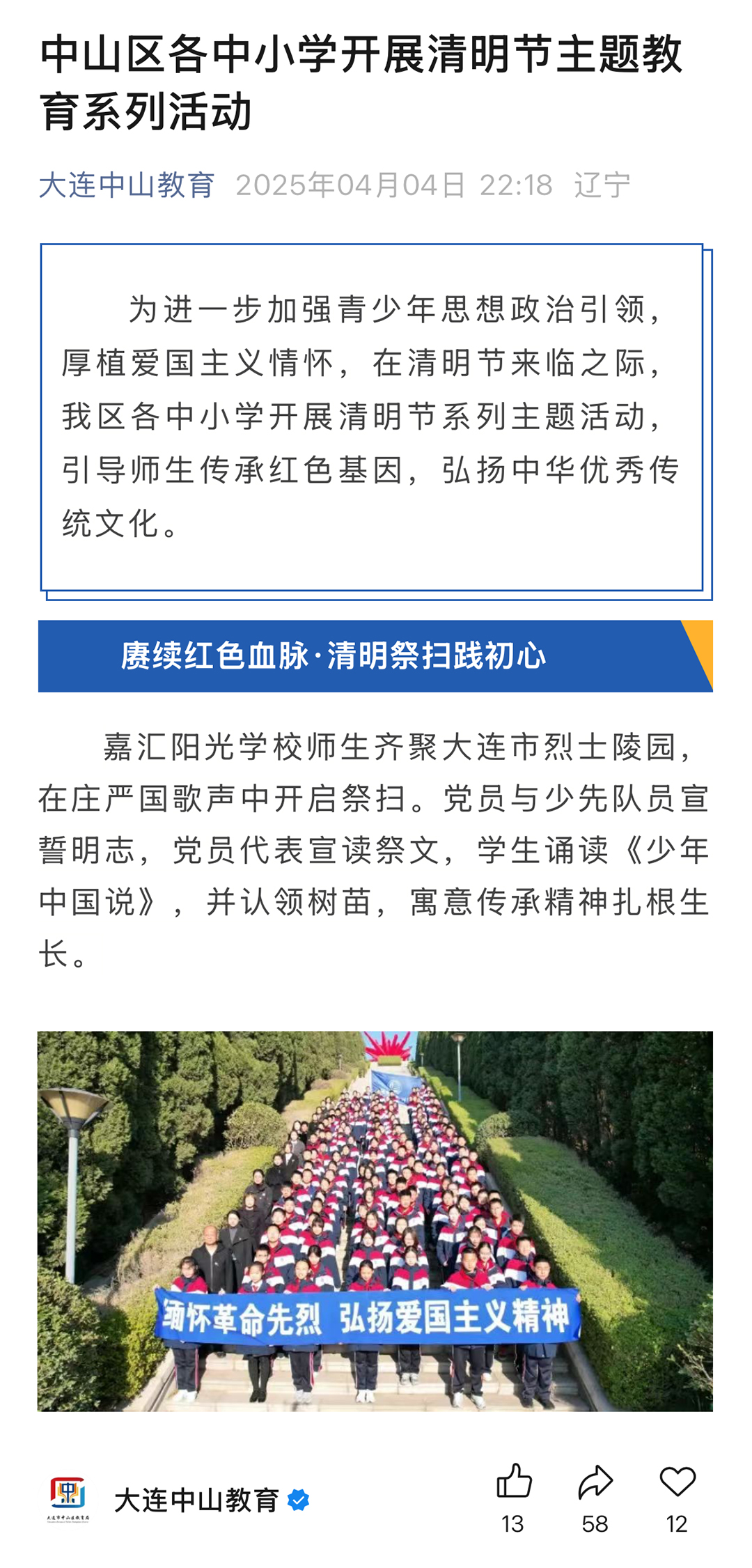 大連市中山區(qū)教育局在大連中山教育公眾號中報道嘉匯陽光學(xué)校烈士祭祀活動。
