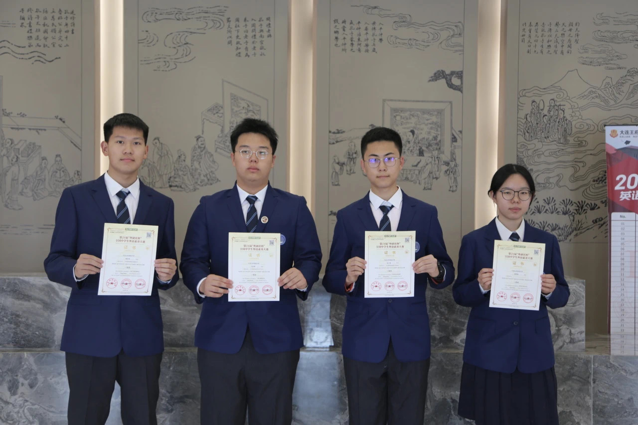 日前,在第 21 屆 「外研社杯」 全國中學(xué)生外語素養(yǎng)大賽全國總決賽的舞臺上,大連王府高級中學(xué)高三·3 班馬世騫、高二·1 班董曉奧、高二·4 班張廣宸、高一·5 班柳永銘四位同學(xué),憑借自身出色的表現(xiàn),一舉斬獲全國一等獎,展現(xiàn)出令人贊嘆的英語素養(yǎng)與思辨能力。