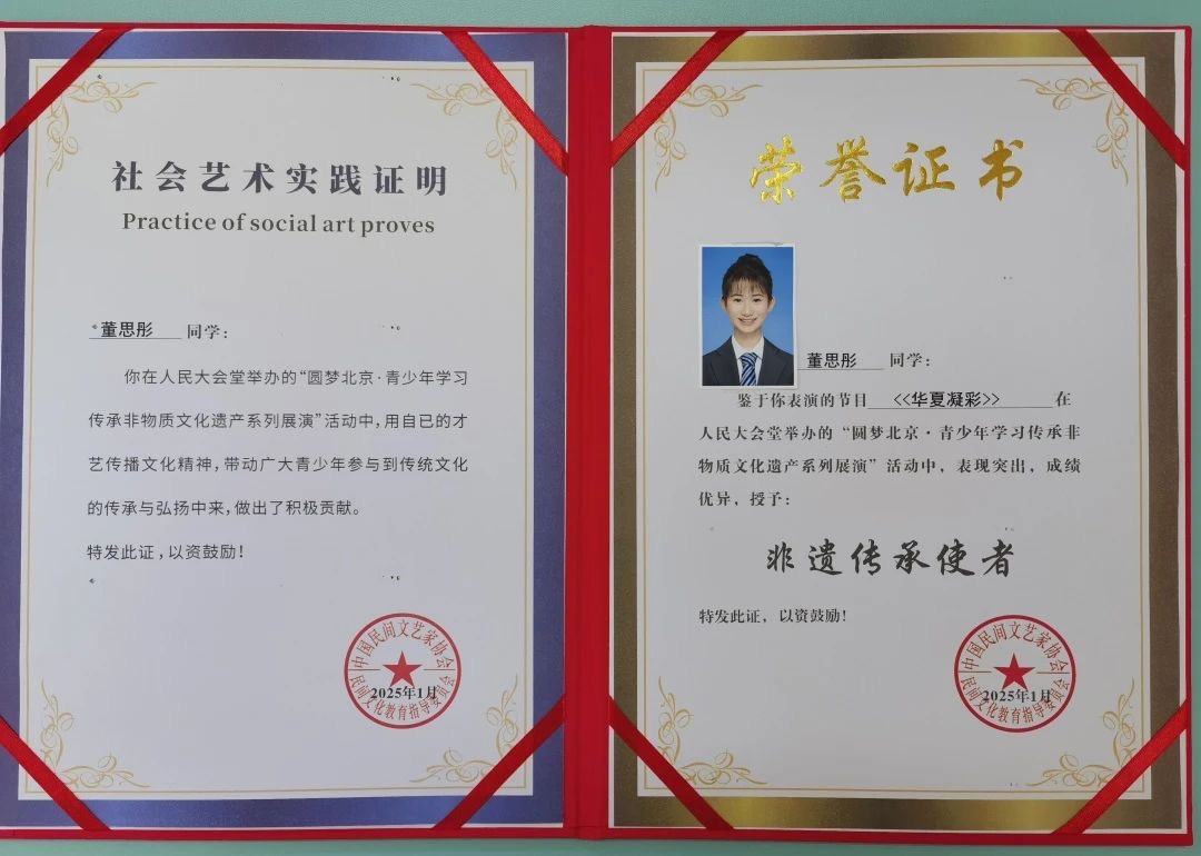 近日,在人民大會堂舉辦的 「圓夢北京·青少年學(xué)習(xí)傳承非物質(zhì)文化遺產(chǎn)系列展演」 活動中,大連王府外國語初中董思彤同學(xué)憑借出色的才藝表現(xiàn)和深厚的文化素養(yǎng),榮獲 「非遺傳承使者」 稱號!