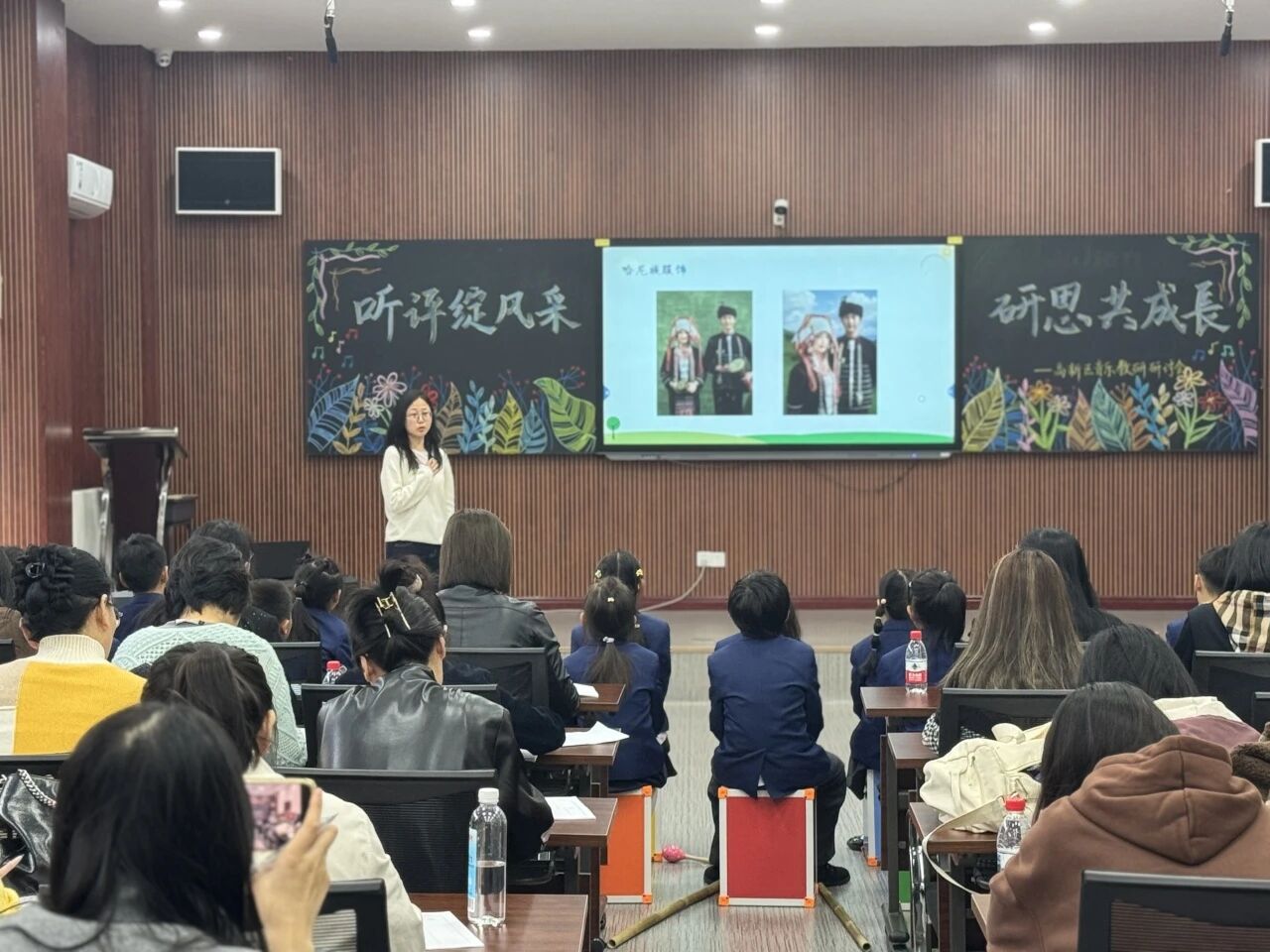 教研員呂老師結(jié)合課例進(jìn)行深度點(diǎn)評,既肯定了授課教師的亮點(diǎn) —— 如 「關(guān)注學(xué)生主體地位」「注重音樂體驗(yàn)的層次性」,也針對教學(xué)細(xì)節(jié)提出優(yōu)化建議:「在節(jié)奏教學(xué)中,可以增加 『學(xué)生自主創(chuàng)編節(jié)奏型』 的環(huán)節(jié),進(jìn)一步培養(yǎng)學(xué)生的音樂創(chuàng)造力;在民族音樂教學(xué)中,可結(jié)合地域文化資源,讓學(xué)生更貼近本土音樂傳承。」 同時(shí),教研員還圍繞 「如何在音樂課堂落實(shí)審美感知、藝術(shù)表現(xiàn)、文化理解三大核心素養(yǎng)」 進(jìn)行專題分享,從教學(xué)目標(biāo)設(shè)定、教學(xué)活動設(shè)計(jì)、評價(jià)方式優(yōu)化等方面給出具體指導(dǎo),為老師們后續(xù)教學(xué)提供了清晰的方向。